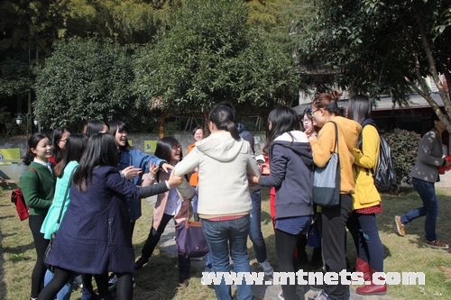 大家先在一個大草坪上休憩片刻,隨后玩起了“五毛一塊”的游戲。男生做五毛,女生做一塊。主持人喊:六塊五,那么必須牽手或者搭肩圍成一個圈。可以是6個女生與1個男生的組合,也可以是5個女生與3個男生的組合。由于編輯部男生少,于是主持人又想出一個更好的方案,戴眼鏡的算五毛,不戴眼鏡的算一塊,同時,戴眼鏡的又可靈活變動,摘下戴上,以免湊不齊或數(shù)量過多的出現(xiàn)。最后,令大家意想不到的是往往最后獲勝的兩位,還一起表演節(jié)目。玩伴們直呼過癮,卻也大呼上當(dāng),贏或者不贏都顯得好難。