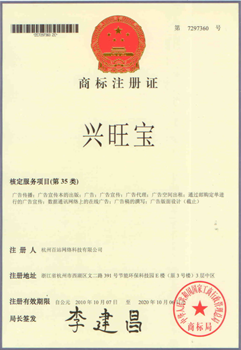 明通子公司百站網絡的注冊商標為“興旺寶”,由旗下24大行業網站共同使用,核定服務項目為第35類,具體包括廣告傳播;廣告宣傳本的出版;廣告;廣告宣傳;廣告代理;廣告空間出租;通過郵購訂單進行的廣告宣傳;數據通訊網絡上的在線廣告;廣告稿的撰寫;廣告版面設計等服務項目。