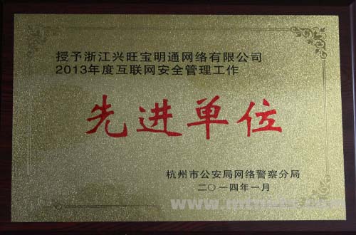1月7日,2013年杭州互聯(lián)網(wǎng)企業(yè)新春會(huì)暨杭州市網(wǎng)絡(luò)協(xié)會(huì)年會(huì)在杭州召開(kāi),會(huì)上表彰了2013年在互聯(lián)網(wǎng)安全管理工作中的先進(jìn)單位和先進(jìn)個(gè)人。會(huì)議上,杭州市公安局網(wǎng)絡(luò)警察分局對(duì)在2013年度中成績(jī)突出的20家單位予以通報(bào)表彰并進(jìn)行授牌,浙江興旺寶明通網(wǎng)絡(luò)有限公司榮獲“2013年度互聯(lián)網(wǎng)安全管理工作先進(jìn)單位”稱(chēng)號(hào)。