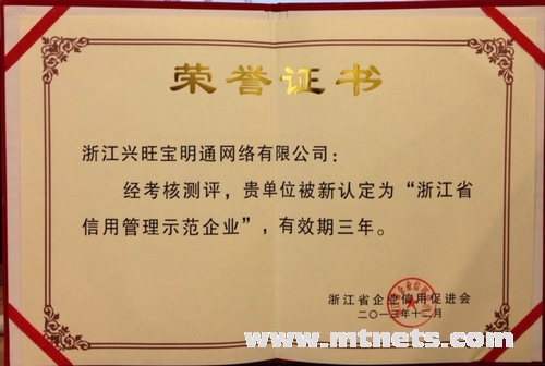 日前,浙江興旺寶明通網(wǎng)絡(luò)有限公司通過“浙江省信用管理示范企業(yè)”的審核認(rèn)定,榮譽(yù)資質(zhì)又添一項(xiàng)。誠信為本是企業(yè)文化的第一條,也是最重要的一條,對(duì)社會(huì)誠信,對(duì)客戶誠信,對(duì)同事誠信是所有明通人的核心價(jià)值觀。
