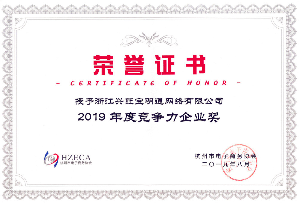 浙江興旺寶明通網絡有限公司榮獲“2019年度競爭力企業獎”