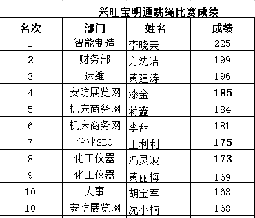 第一名是來(lái)自智能制造網(wǎng)的李曉美,一分鐘跳繩成績(jī)高達(dá)225次,小編看到這兒已經(jīng)驚呆了,要知道我國(guó)一分鐘跳繩最高記錄就是286次,果然天外有天,高手在民間啊。值得一提的是,這位小伙伴也是公司全體參賽人員中唯一突破200個(gè)大關(guān)的選手,果然就像主持人介紹的那樣,別看人家看著個(gè)子小,爆發(fā)起來(lái)是一鳴驚人,厲害!
