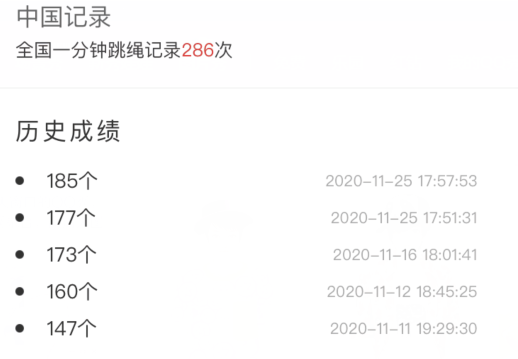 本次跳繩活動(dòng)中,因?yàn)榭梢圆幌薮螖?shù)進(jìn)行跳繩,我們也看到不少小伙伴反復(fù)練習(xí)、多次嘗試。比如來(lái)自安防展覽網(wǎng)的漆金就在11月11日到25日期間跳了五次,成績(jī)也是不斷地“更上一層樓”,從最初的147個(gè)跳到了最后的185個(gè)。